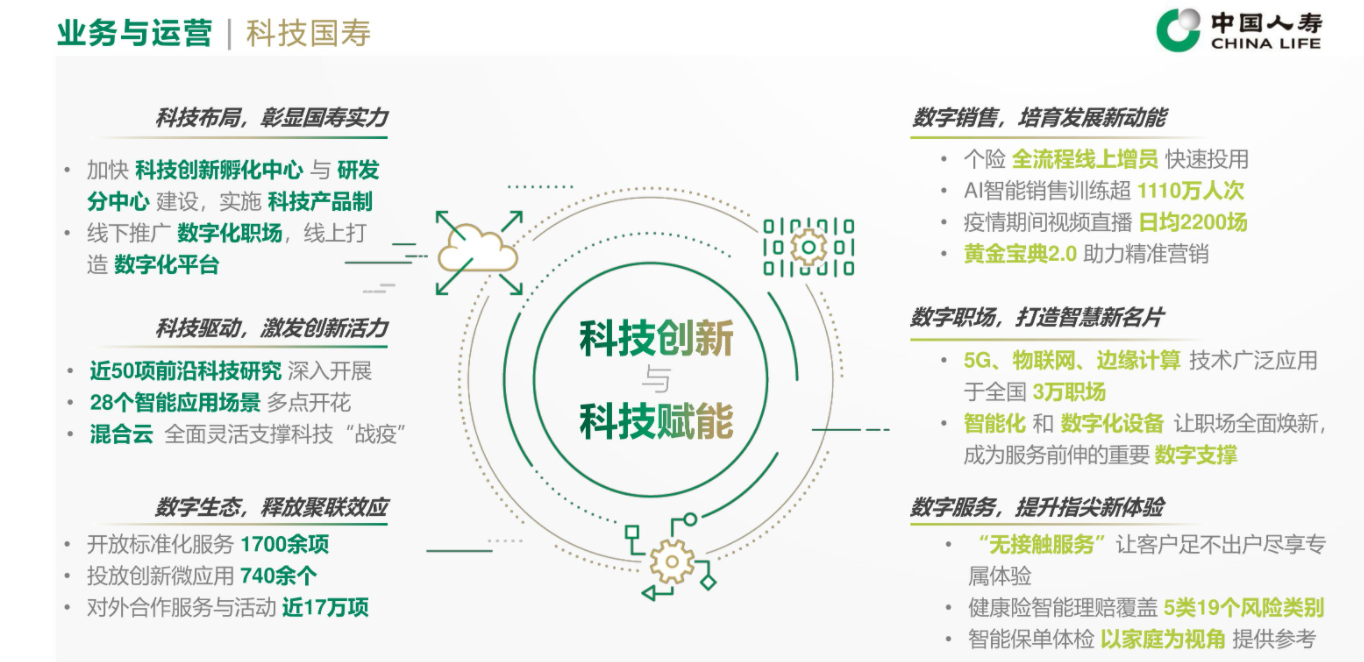 大个险助推下保费端的复苏,也对应着投资端和与之匹配的投资风格的改变。中国人寿投资端口的改革,乃之过去两年业绩的有力保障。 过去的近三年间,中国人寿投资板块在“以配置为引领,推动策略优化;以账户为维度,统筹委托管理”的策略下,对投资条线进行了组织架构和职级绩效薪酬体系的市场化改革。 这一式颇为见效,配合前端不断上升的保费,2020年中国人寿投资收益逼近2000亿,2018年仅1300亿量级。 第三卷 科技数字奇经:打通进化壁垒 除了苍劲可视的业绩,还有什么造就了中国人寿之鼎新? 这需要回答一个问题,中国人寿发展的最大矛盾是什么?表面看是机制体制问题、是市场化不畅、是人员组织架构老化、是大中心城市竞争力不足、是销售渠道效率低下......实质上是百年未有之大变局与原有保险商业模式之间适配性的问题。 这引出了中国人寿鼎新的另一个杀手锏,科技化与数字化赋能。 还是2019年初,中国人寿在产品、渠道等经营话题之外,还着重提及了“强化科技,强化创新驱动”的战略愿景: 将加大移动互联、数字化、智能化,三大科创领域的投入,以科技来赋能销售,赋能销售,赋能管理,实现公司、客户与队伍三者之间的紧密互动,形成线上线下一体的国寿特色业务新模式。 随之,《“科技国寿”建设三年行动方案》出炉,确定了各单位每年科技投入占当年营业收入的刚性比例: 保险类公司2019年要达到0.5%,3年后要达到1%。只有投入真金白银,才能真枪实弹。 2019年7月,重振国寿下的顶层设计“鼎新工程”全面启动后,再次明确了科技“业务驱动、科技创新、深度融合、赋能中心、周边创新”的定位。 经过三年时间,中国人寿目前已经逐渐形成了实施以产品为中心的科技运作机制,建造线下数字化职场、线上数字化平台数字化商业新模式,并基于云计算实现了数字化、智能化经营管理新布局。 展现在具体赋能应用方面,如: 销售方面:科技业务有效联动,致力于运用数字技术创新展业形式。2020年,AI智能销售在线培训15.5万期合计1,110万人次;直播早会、云创会、产品特卖会等百花齐放,疫情期间达日均2,200场;“黄金宝典2.0”全面升级,以更强大的智能算法助力精准营。 服务方面:线上服务能力和业务数字化处理能力快速提升。疫情期间快速响应建成“抗击新冠肺炎疫情服务专区”,推出新单承保全流程无接触服务,全新打造“空中客服”,客户能够随时随地一键连接空中柜员,足不出户即可贴心办理业务。构建覆盖全国2万余家医疗机构的理赔直付网络,全年为客户提供直赔服务500余万人次; 运营方面:将人工智能技术全面融入运营管理各环节。2020年,公司个人长险业务无纸化投保率达99.9%,团体业务无纸化投保推广率达97.9%,智能核保、保全业务自动审核通过率分别达92.7%、99%,新单电子化回访替代率达92%。建立基于大数据和人工智能技术的健康险智能理赔模型,覆盖5大类19个关键风险类别,让理赔更高效、便捷。 今天的业绩发布会上,中国人寿再度重申科技也是之核心竞争力的重要组成部分,要强化科技创新引领,进一步提升科技水平。 2019年之前,鲜见如此规格的科技战略。