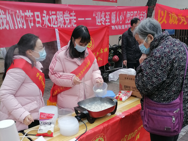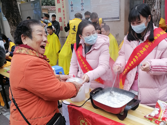 向群众派送新年小礼品 活动以“我们的节日·永远跟党走”为主题,现场为社区居民送汤圆以及台历、中国结等精美新年小礼品,并提供测量血压、爱心义剪等志愿服务。中心志愿者们现场烹煮热腾腾的汤圆,并分发给到场的上百名社区居民,得到群众们的一致称赞和好评。