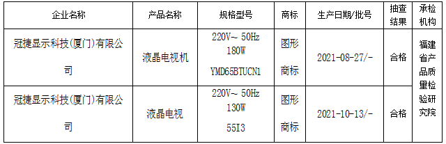 近期,依据《中华人民共和国产品质量法》,福建省市场监督管理局组织对彩色电视机产品开展产品质量省级监督抽查,共抽查 1家生产企业 2批次产品,合格率为100%。 本次抽查依据GB/T 13837-2012、GB 8898-2011、GB 24850-2020、SJ/T 11343-2015等标准的要求,对正常工作条件下的发热、防电击保护的结构要求、正常工作条件下的电击危险、绝缘要求、电气间隙和爬电距离、端子、外接软线、亮度、对比度、重显率、静态清晰度、亮度均匀性、色域覆盖率、声频率响应特性、能效指数、被动待机功率、电源端骚扰电压、辐射骚扰场强、谐波电流等19个项目进行了检验。抽查发现2批次产品均符合标准的规定。 根据《产品质量监督抽查管理暂行办法》(国家市场监督管理总局第18号令)规定,现将抽查结果予以公告。 福建省彩色电视机产品质量省级监督抽查结果(合格)