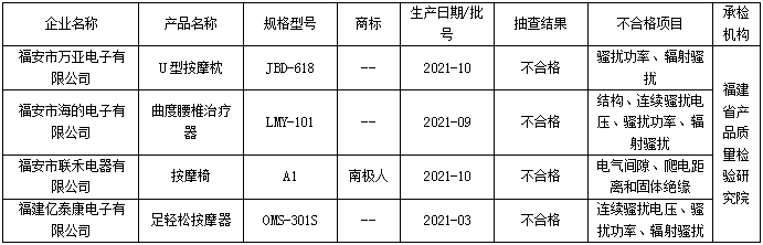 表2 福建省按摩器具产品质量省级监督抽查结果(不合格)