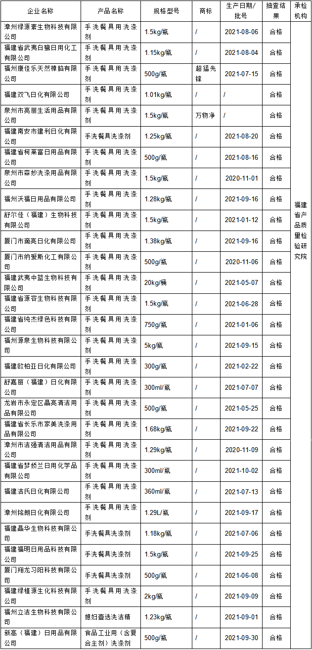 近期,依据《中华人民共和国产品质量法》和相关产品标准及抽查细则明确项目,福建省市场监督管理局组织对食品用洗涤剂开展省级监督抽查,共抽33家生产企业生产的33批次产品,其中3批次不合格,不合格发现率为9.09%。 省市场监管局已责成市市场监管局对本次抽查不合格产品及其生产企业依法予以处理。 根据《产品质量监督抽查管理暂行办法》(国家市场监督管理总局第18号令)规定,现将抽查结果予以公告。 表1 福建省食品用洗涤剂产品质量省级监督抽查结果(合格)