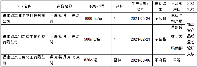 表2 福建省食品用洗涤剂产品质量省级监督抽查结果(不合格)