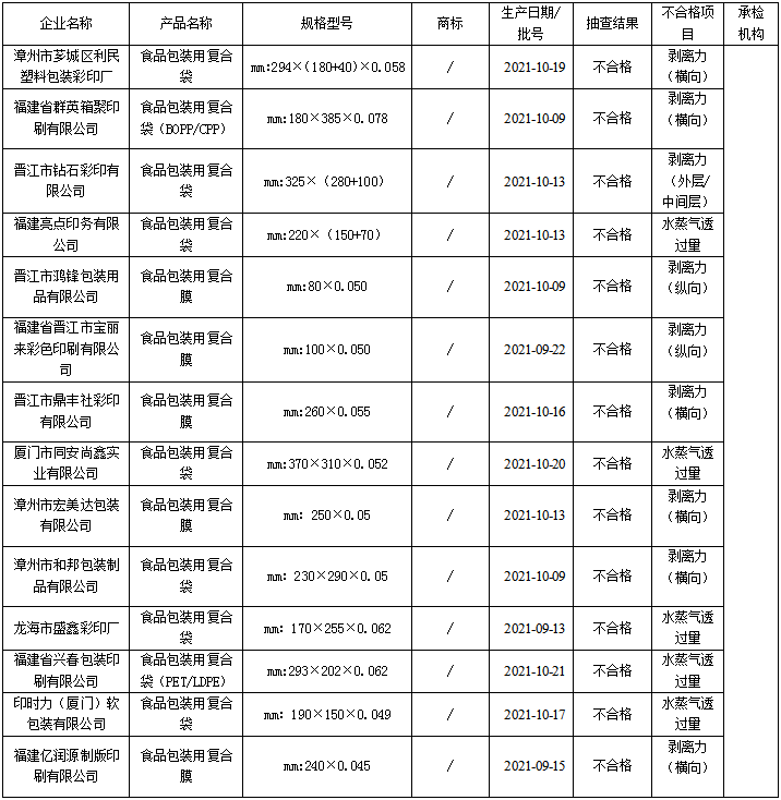 近期,依据《中华人民共和国产品质量法》和相关产品标准及抽查细则明确项目,福建省市场监督管理局组织对复合膜袋制品开展产品质量省级监督抽查,抽查产品主要为复合膜袋制品,共抽查195家生产企业生产的221批次产品,其中14批次不合格,不合格发现率为6.3%。 省市场监管局已责成市市场监管局对本次抽查不合格产品及其生产企业依法予以处理。 根据《产品质量监督抽查管理暂行办法》(国家市场监督管理总局第18号令)规定,现将抽查结果予以公告。 表2 福建省复合膜袋制品产品质量省级监督抽查结果(不合格)