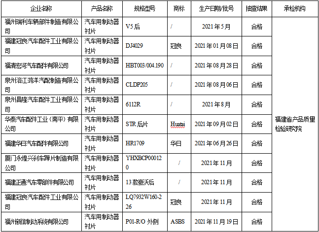 近期,依据《中华人民共和国产品质量法》和相关产品标准及抽查细则明确项目,福建省市场监督管理局组织对摩擦材料产品质量开展省级监督抽查。本次共抽查汽车用制动器衬片产品11批次、汽车用离合器面片产品1批次,均未发现不合格。抽查摩托车和轻便摩托车制动蹄/制动衬组件产品15家生产企业生产的15批次产品,其中1批次不合格,不合格发现率为6.67%。 省市场监管局已责成市市场监管局对本次抽查不合格产品及其生产企业依法予以处理。 根据《产品质量监督抽查管理暂行办法》(国家市场监督管理总局第18号令)规定,现将抽查结果予以公告。 表1 福建省汽车用制动器衬片产品质量省级监督抽查结果(合格)