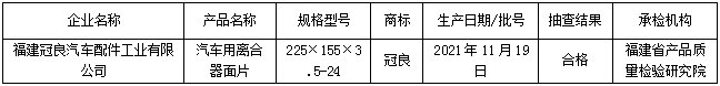 表2 福建省汽车用离合器面片产品质量省级监督抽查结果(合格)