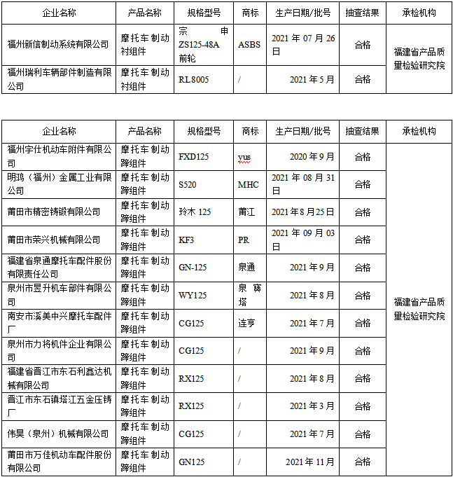 表3 福建省摩托车和轻便摩托车制动蹄/制动衬组件产品质量省级监督抽查结果(合格)