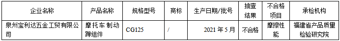 表4 福建省摩托车和轻便摩托车制动蹄/制动衬组件产品质量省级监督抽查结果(不合格)
