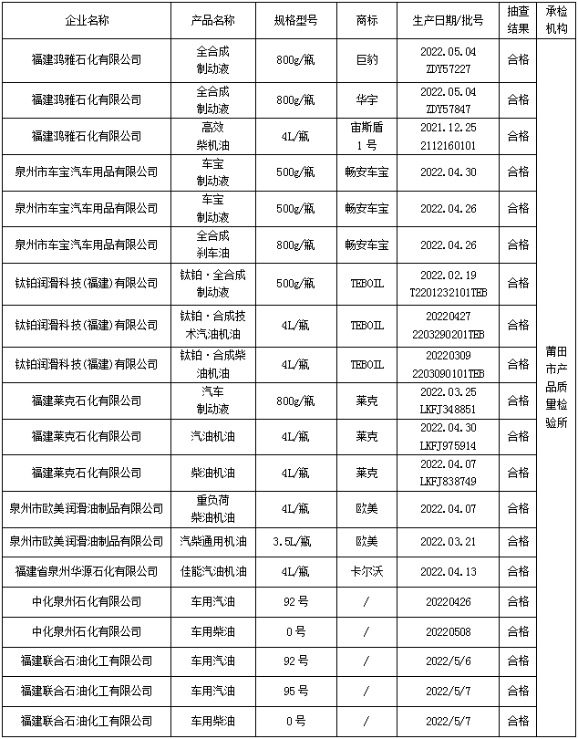 近期,依据《中华人民共和国产品质量法》和相关产品标准及抽查细则明确项目,福建省市场监督管理局组织对石油产品开展产品质量省级监督抽查,抽查产品包括车用汽油、车用柴油、汽油机油、柴油机油、机动车辆制动液,共抽查8家生产企业20批次产品,合格率为100%。 根据《产品质量监督抽查管理暂行办法》(国家市场监督管理总局第18号令)规定,现将抽查结果予以公告。 福建省石油产品质量省级监督抽查结果(合格)