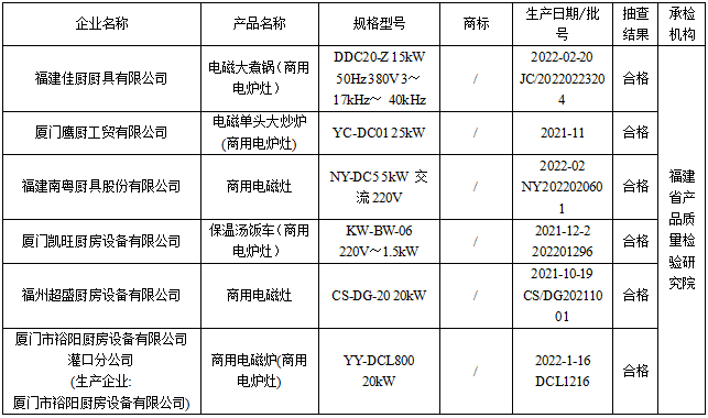 近期,依据《中华人民共和国产品质量法》和相关产品标准及抽查细则明确项目,福建省市场监督管理局组织对商用电炉灶产品开展产品质量省级监督抽查,共抽查6家生产企业6批次产品,合格率为100%。 根据《产品质量监督抽查管理暂行办法》(国家市场监督管理总局第18号令)规定,现将抽查结果予以公告。 福建省商用电炉灶产品质量省级监督抽查结果(合格)