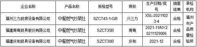 近期,依据《中华人民共和国产品质量法》和相关产品标准及抽查细则明确项目,福建省市场监督管理局组织对商用燃气燃烧器具产品开展产品质量省级监督抽查,共抽查3家生产企业3批次产品,合格率为100%。 根据《产品质量监督抽查管理暂行办法》(国家市场监督管理总局第18号令)规定,现将抽查结果予以公告。 福建省商用燃气燃烧器具产品质量省级监督抽查结果(合格)
