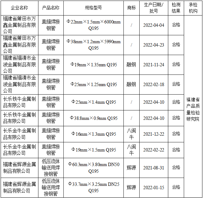 近期,依据《中华人民共和国产品质量法》和相关产品标准及抽查细则明确项目,福建省市场监督管理局组织对生产领域的焊接钢管产品进行省级监督抽查,共抽查5家生产企业的10批次产品,合格率为100%。 根据《产品质量监督抽查管理暂行办法》(国家市场监督管理总局第18号令)规定,现将抽查结果予以公告。 表1 福建省焊接钢管产品质量省级监督抽查结果(合格)
