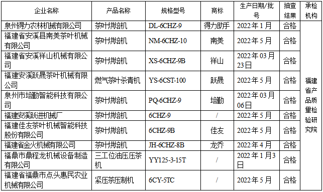 近期,依据《中华人民共和国产品质量法》和相关产品标准及抽查细则明确项目,福建省市场监督管理局组织对茶叶机械产品开展产品质量省级监督抽查,共抽查10家生产企业10批次产品,合格率为100%。 根据《产品质量监督抽查管理暂行办法》(国家市场监督管理总局第18号令)规定,现将抽查结果予以公告。 福建省茶叶机械产品质量省级监督抽查结果(合格)