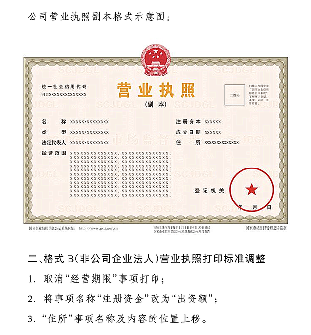 近日,市场监管总局办公厅印发通知调整营业执照照面内容。 市场监管总局办公厅关于调整营业执照照面事项的通知 市监注发〔2022〕71号 各省、自治区、直辖市和新疆生产建设兵团市场监管局(厅、委): 《市场主体登记管理条例》及其实施细则进一步统一和优化了市场主体的登记事项,营业执照正副本照面内容要作相应调整。现就有关事项通知如下: 一、公司、非公司企业法人、合伙企业、分支机构等类型市场主体的营业执照不再记载“营业期限”“经营期限”“合伙期限”信息项,合伙企业、个人独资企业营业执照增加“出资额”信息项,部分类型市场主体营业执照的事项名称及事项位置进行相应调整(具体调整说明见附件)。除调整部分外,营业执照的格式分类、印刷标准等继续按照《市场监管总局关于启用新版营业执照的通知(国市监注〔2018〕253 号)中《营业执照印制标准(2019 年版)《营业执照打印标准(2019 年版)等相关要求执行。 二、自2022年9月1日起,经登记机关准予设立、变更登记以及补发营业执照的各类市场主体,颁发调整版式后的营业执照。之前存续的各类市场主体,可以继续使用原版营业执照,也可以直接申请换发新版营业执照。 各省、自治区、直辖市和新疆生产建设兵团市场监管局(厅、委)要确保按时进行新版营业执照的启用换发工作。新版营业执照在使用中出现的情况及问题,要及时报告市场监管总局。 附件:营业执照记载内容调整说明 市场监管总局办公厅 2022年7月25日 营业执照记载内容 详细调整情况如下 自2022年9月1日起,经登记机关准予设立、变更、登记,就可以领到新版营业执照了! |
