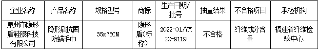 近期,依据《中华人民共和国产品质量法》和相关产品标准及抽查细则明确项目,福建省市场监督管理局组织对生产企业毛巾产品质量开展省级监督抽查。本次共抽查了5家生产企业5批次产品,其中1批次不合格,不合格发现率为20%。 省市场监管局已责成市市场监管局对本次抽查不合格产品及其生产企业依法予以处理。 根据《产品质量监督抽查管理暂行办法》(国家市场监督管理总局第18号令)规定,现将抽查结果予以公告。 表2 福建省毛巾产品质量省级监督抽查结果(不合格)