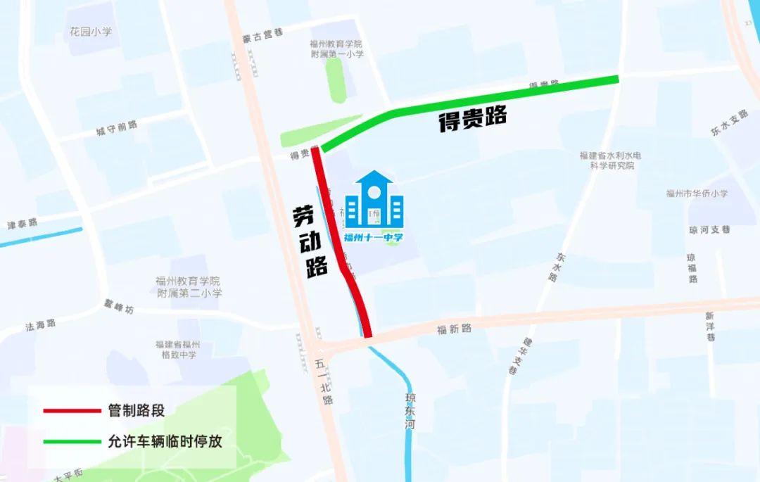 1.管制路段:劳动路 2.允许车辆临时停放路段:得贵路 福州铜盘中学