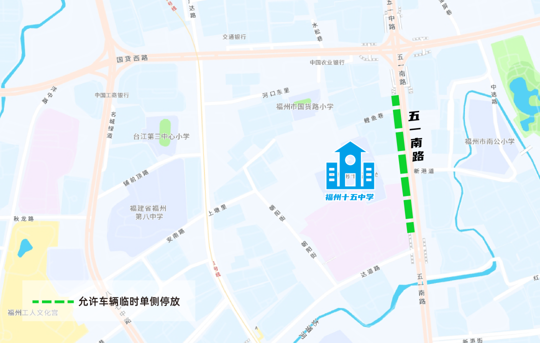 允许车辆临时单侧停放路段:五一南路西侧(国货路—达道路) 福州第四中学
