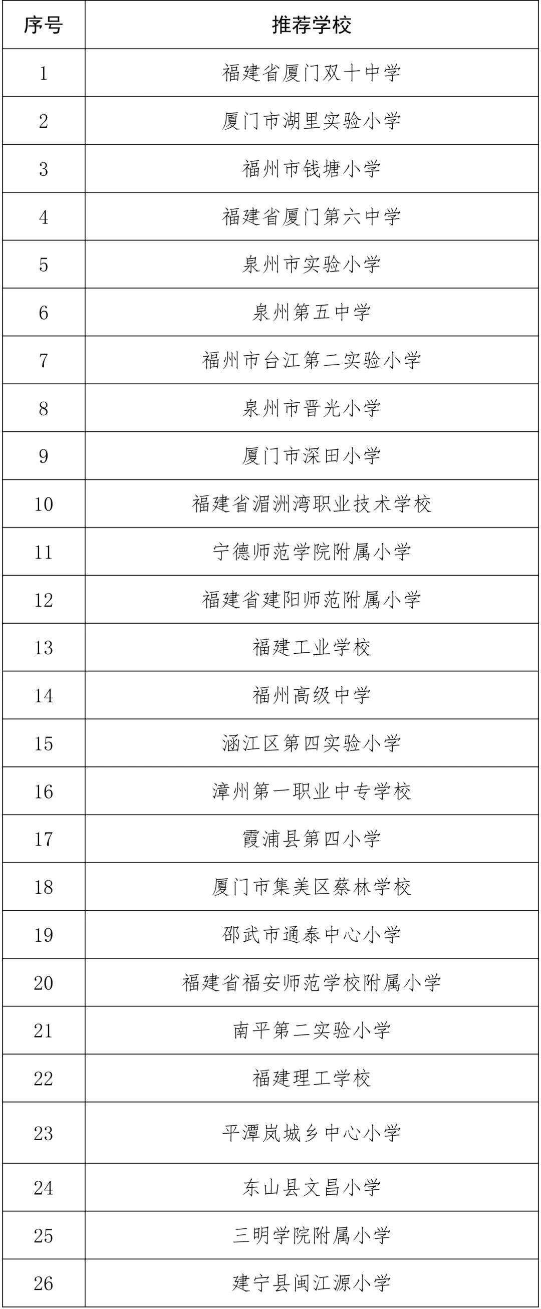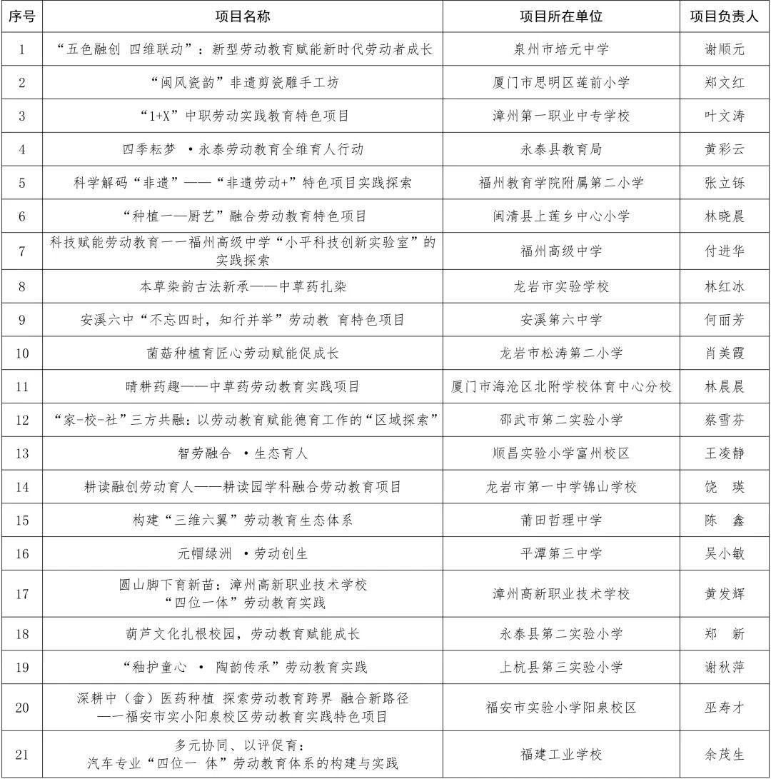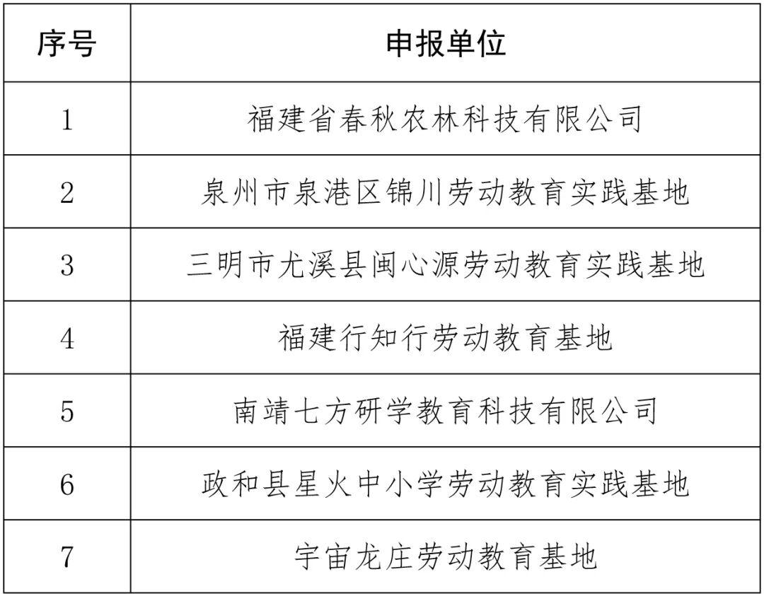 省教育厅日前印发《关于公布第六批中小学劳动教育实践基地等六项特色项目的通知》,确定福建省春秋农林科技有限公司等7个申报单位入选福建省第六批中小学劳动教育实践基地名单;泉州市培元中学《“五色融创 四维联动”:新型劳动教育赋能新时代劳动者成长》等21个项目入选福建省第七批劳动教育实践特色项目名单;福建行知行研学实践教育基地等10个申报单位入选福建省第八批中小学生研学实践教育基地名单;德化县中小学生社会实践基地等1个申报单位入选福建省第八批中小学生研学实践教育营地名单;厦门市翔安区《“翔”爱看:翔安区“五图”擘画“五共阅读”均衡育人新生态》等9个案例入选福建省区域读书案例名单;福建省厦门双十中学等26个申报单位入选福建省书香校园名单。 福建省第六批劳动教育实践基地入选名单