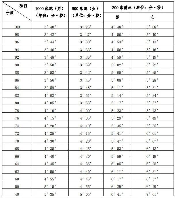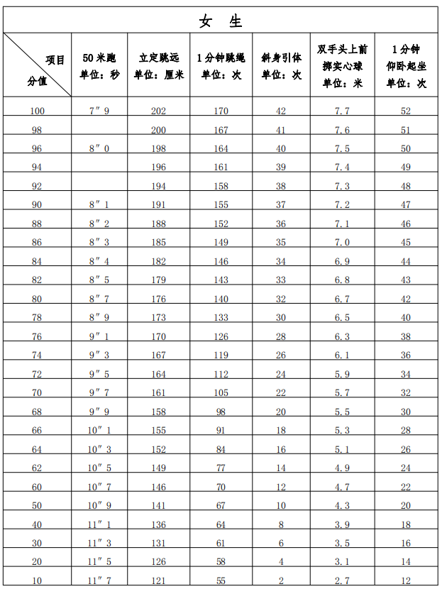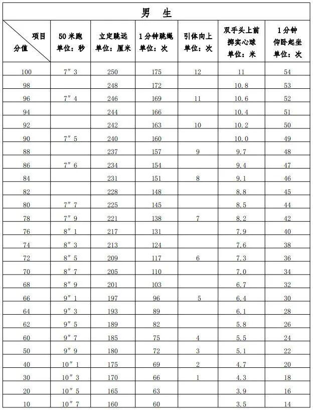 根据《南平市教育局关于印发<南平市初中毕业升学体育考试工作实施意见(试行)>的通知》(南教综〔2019〕34号)和《福建省教育厅关于印发<进一步加强中小学体育工作提升学生体质健康水平若干措施>的通知》(闽教体〔2025〕15号)要求,南平市教育局按照规范流程,经随机抽选,确定2026年南平市初中毕业升学体育考试“身体素质与运动技能测试”项目为: 1.必考类项目: 男生,1000米跑;女生,800米跑。 2.选考类项目: 篮球(运球绕杆往返)、足球(运球绕杆)、排球(40秒对墙壁垫球),由考生从三个项目中自选一项考试。 3.抽考自选类项目: 1分钟跳绳、引体向上(男)斜身引体(女)、双手头上前掷实心球(考生从这三个项目中自选其中两项考试)。 在考试内容方面,体育与健康基本知识考试将调整为日常检测,原中考分值(4分)调整至运动技能测试。 中考体育分值结构上,保持总分值40分不变,具体分配为:必考类15分(1000米/800米跑)、选考类9分(“三大球”)、抽选考类16分(50米跑、立定跳远、1分钟跳绳、引体向上/斜身引体、双手头上前掷实心球、1分钟仰卧起坐)。 来看看评分标准↓ ↓ 福建省初中毕业升学体育与健康考试 身体素质与运动技能测试评分标准 (一)必考类