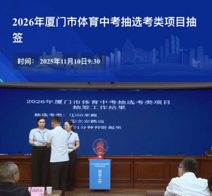 2026年厦门市初中毕业升学体育考试抽选考类测试项目抽签结果公布。 抽选考类六选三是:50米跑、1分钟仰卧起坐、立定跳远。考生可从三个项目中自选2项考试。