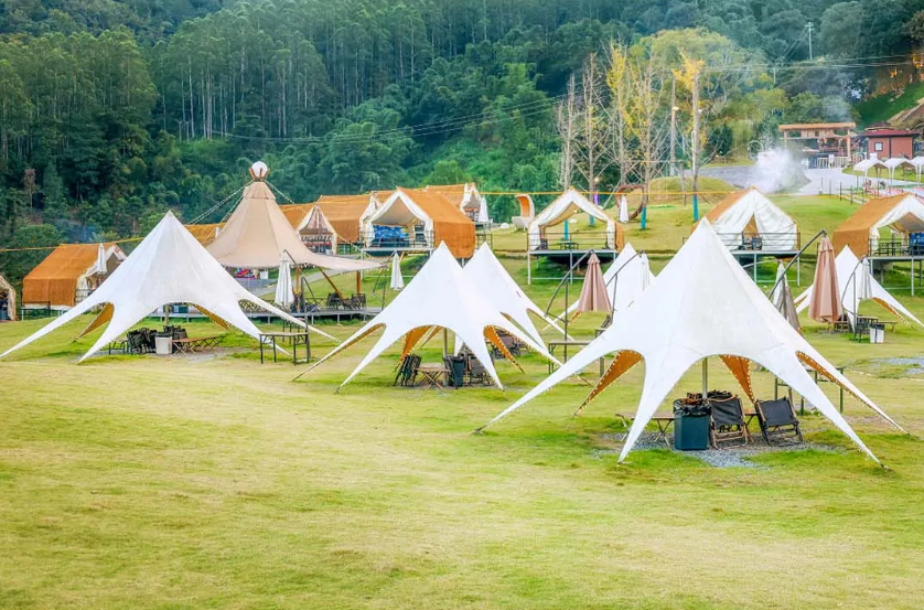 步入营地,一顶顶精致天幕、特色帐篷与远山绿林相映成趣,炭火嗞嗞作响,美食香气四溢,市民游客可以在逛吃赏玩间邂逅山野烟火的温润质感。