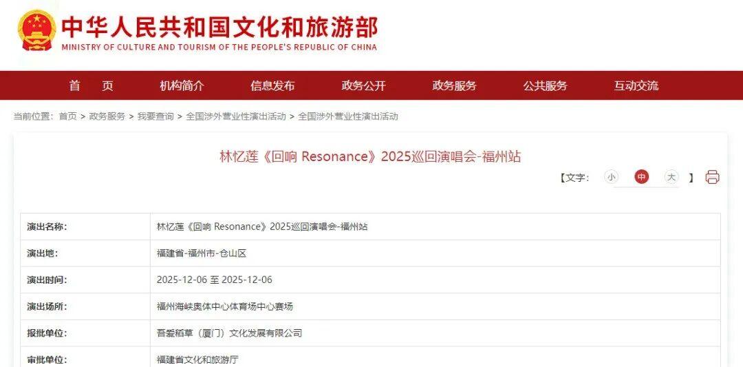林忆莲福州演唱会 据福建省文化和旅游厅官网消息,林忆莲《回响 Resonance》2025巡回演唱会即将在福州举办。