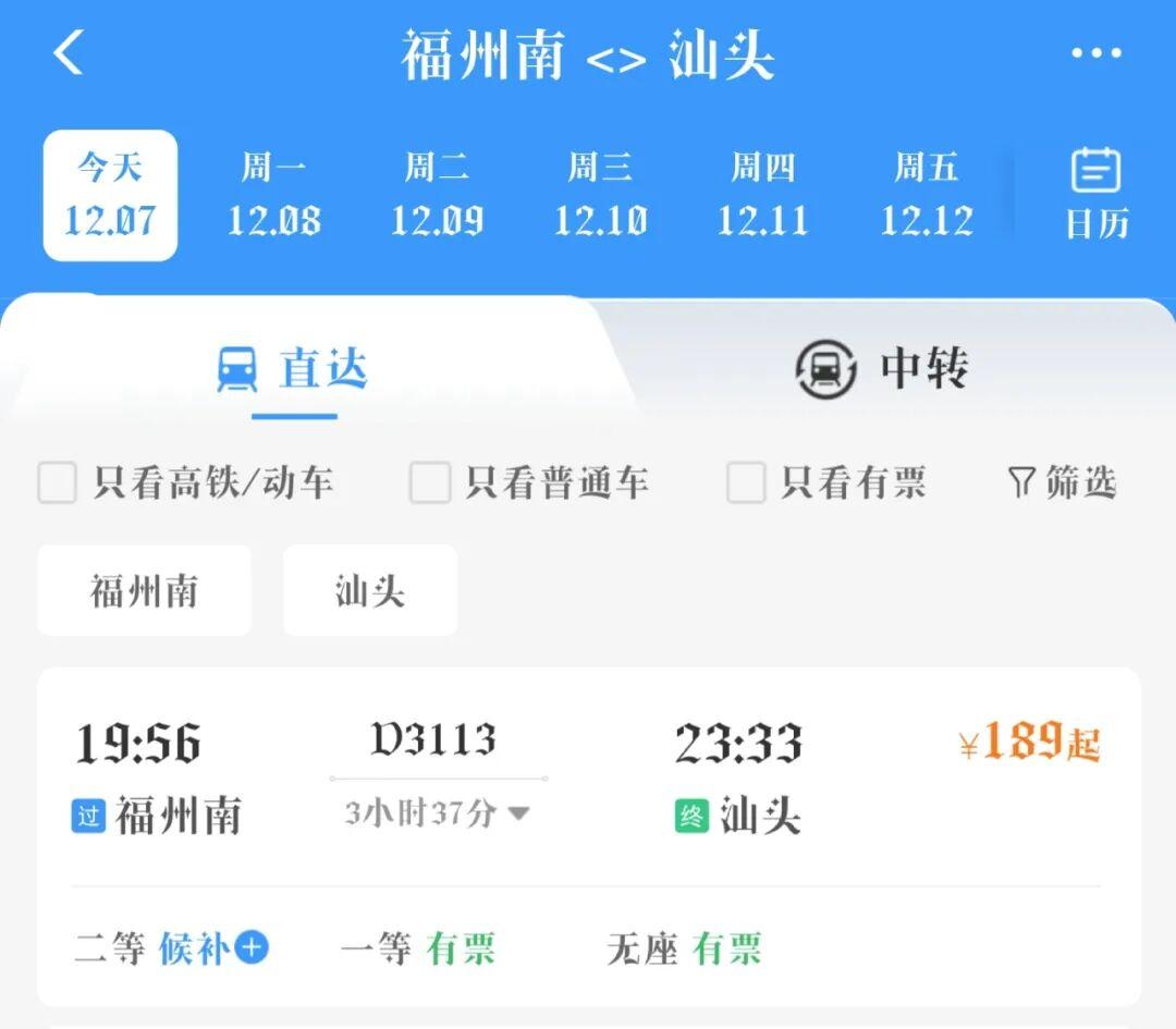 12月5日起,宁波站至广东汕头站直通动车组列车正式开行。该列车经停福州南站,标志着福州市民可乘坐动车直达汕头站,无需再经潮汕站换乘,出行便利性大幅提升。 铁路12306平台显示,D3113次列车于15时52分从宁波站始发,19时52分经停福州南站,随后依次途经福清、涵江、莆田、泉州、厦门北、潮汕等站点,最终于23时33分抵达汕头站。其中,福州南站至汕头站段运行时长约3小时40分,二等座票价为189元。