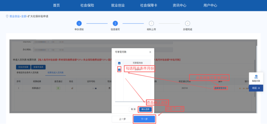 4. 点击“选择享受月份”——勾选“符合条件月份”——点击“确认选择”——点击“下一步”