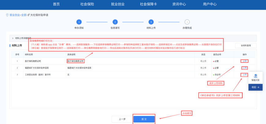 6.按要求上传对应材料——点击提交——办理完成上传材料包括:《福建省扩大社会保险补贴申请表》、医疗保险缴费证明、企业工商营业执照、《单位承诺书》。 注:企业工商营业执照、《单位承诺书》在同一位置上传。