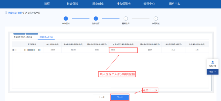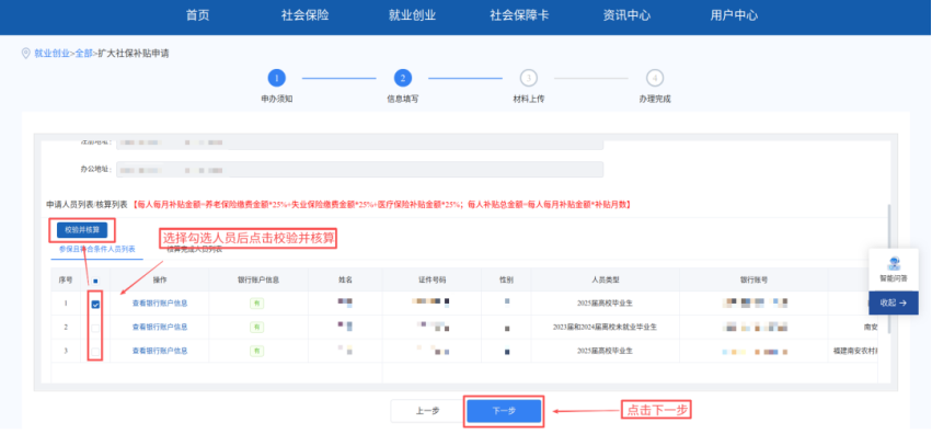 3. 企业经办需先补充完善企业及职工基本信息,勾选人员后点击“校验并核算”——点击“下一步”