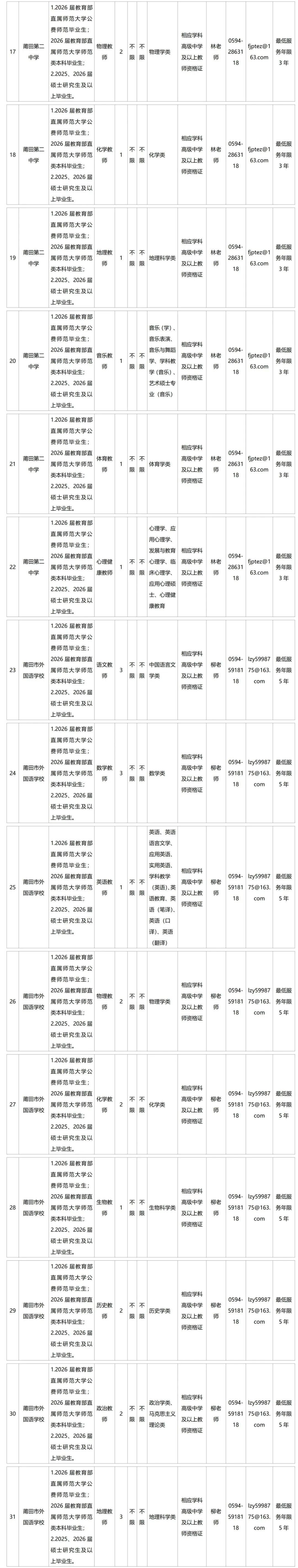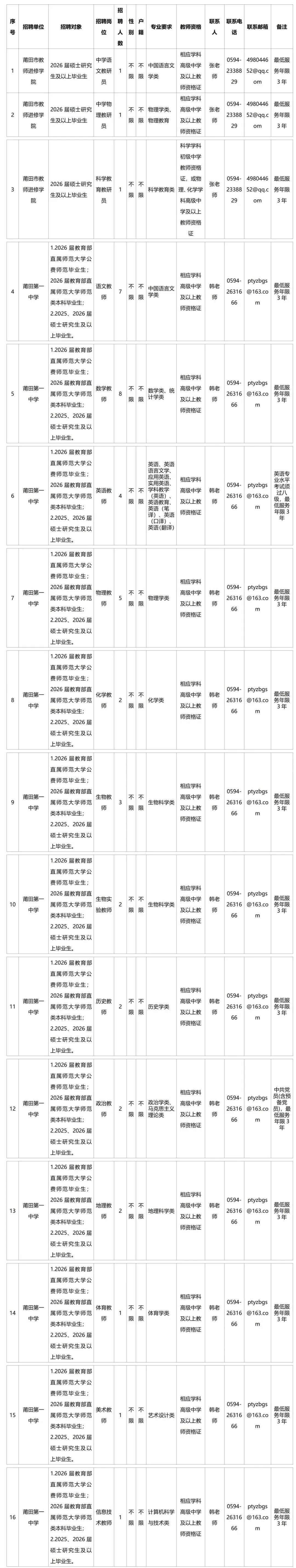 报名时间 ①电子邮件报名时间:2025年12月11日起至12月30日; ②现场报名时间:2025年12月11日起至招聘会当天上午9:30。 报名方式 以电子邮件报名或现场纸质报名两种方式进行。 ①电子邮件报名:将《莆田市市直学校公开招聘2026年新任教师报名表》电子版及毕业证书、学位证书、身份证、就业推荐表及相关证书的原件扫描件,发至各招聘单位报名邮箱; ②纸质报名:将《莆田市市直学校公开招聘2026年新任教师报名表》及毕业证书、学位证书、身份证、就业推荐表及相关证书的复印件一份,向现场宣介人员提供。 详情点击 北京大学附属中学莆田学校公开招聘教师25名 招聘岗位
