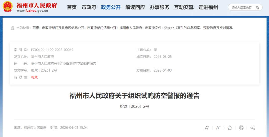 最新通告!福州市政府决定于2026年4月21日上午组织全市试鸣防空警报。