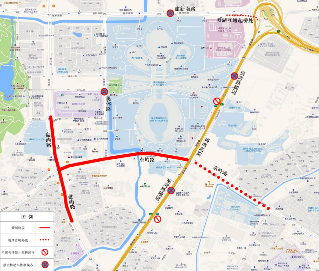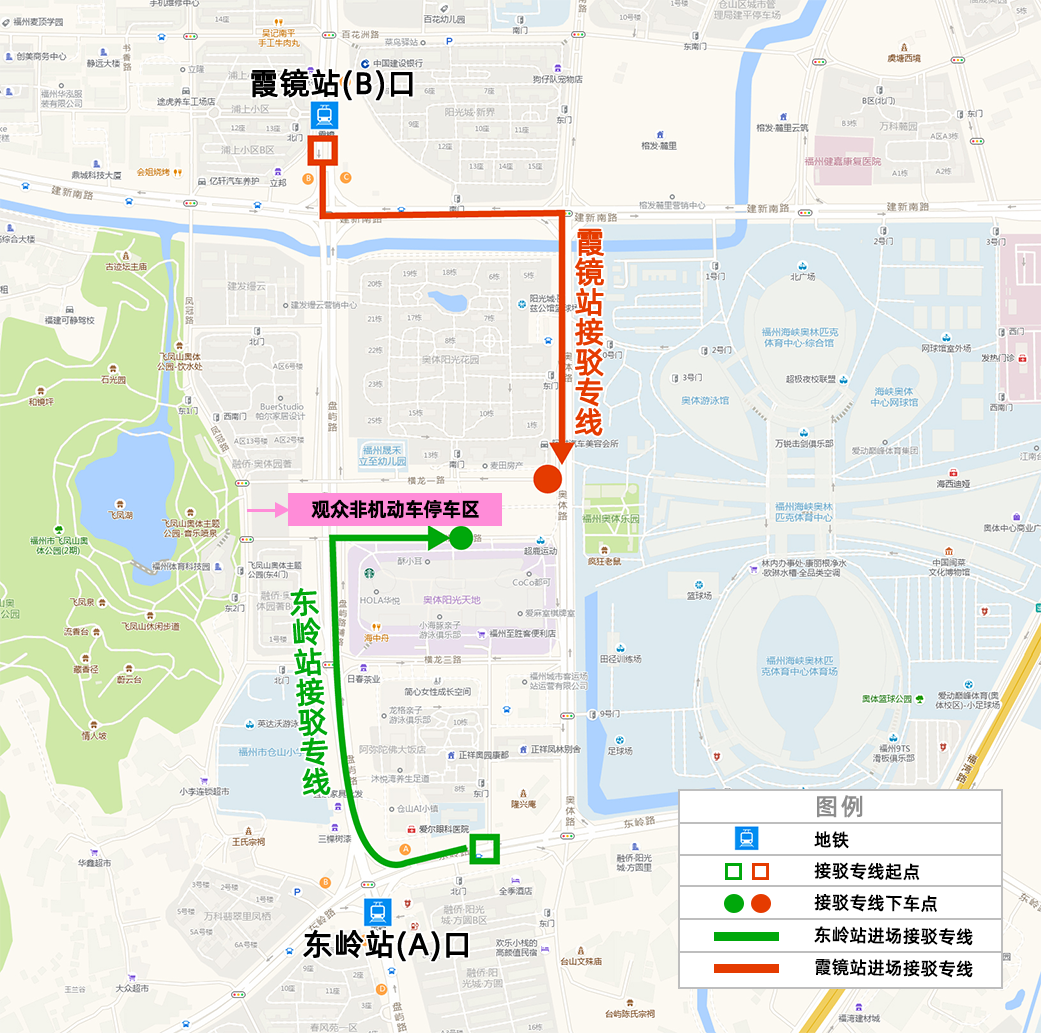 接驳专线 白湖亭接驳专线:可往南步行至海峡奥体中心南广场,至东岭路后往东步行至东岭路福湾辅路口公交接驳点,乘坐接驳专线车直达地铁1号线白湖亭站C口 闽江之心接驳专线:根据引导标识往海峡奥体中心北广场步行至奥体网球馆(北)公交接驳点,乘坐接驳专线车直达闽江之心 苏万宝商圈接驳专线:根据引导标识往北步行至海峡奥体中心北广场(东)接驳点,乘坐接驳专线车直达宝龙城市广场 仓山万达接驳专线:根据引导标识往北步行至海峡奥体中心北广场(西)接驳点,乘坐接驳专线车直达仓山万达广场 地铁 由海峡奥体中心南广场离场,根据引导标识向西步行至地铁5号线东岭站A口; 由海峡奥体中心西广场离场,根据引导标识向南步行至地铁5号线东岭站A口,或向北步行至地铁5号线霞镜站C口。 出租车/网约车 从海峡奥体中心西广场离场,沿奥体路、建新南路步行至鹭岭路网约车停车区A;或从海峡奥体中心北广场(行人专用通道)离场,步行至鹭岭路网约车停车区A; 从海峡奥体中心南广场离场,沿东岭路、福湾辅路步行至永辉停车场出租车停车区B; 从海峡奥体中心西广场离场,过人行横道步行至横龙三路出租车/网约车停车区C; 从海峡奥体中心南广场离场,沿东岭路向东步行至东岭路与福湾路交叉口出租车/网约车停车区D。 !!!再次提醒!!! 赛事期间 海峡奥体中心停车场不对外开放 自驾的朋友可以 选择“P+R”换乘方式直达赛场 省时又省心 具体换乘攻略 4月19日16:00后,自驾车观众可在地铁2号线、4号线、5号线沿线的社会化停车场停车,或在允许停车路段单排平行式停车,再换乘地铁前往观赛。 地铁2号线沿线 ①将车辆停放在苏万宝商圈周边停车场,从祥坂站、宁化站乘坐2号线,经金山站换乘地铁5号线,在霞镜站、东岭站出站。 ②将车辆停放在旗山大道沿线或周边社会化停车场,从董屿·福建师大站乘坐2号线,经金山站换乘地铁5号线,在霞镜站、东岭站出站。 ③将车辆停放在后浦路沿线或周边社会化停车场,从五里亭站乘坐2号线,经金山站换乘地铁5号线,在霞镜站、东岭站出站。 地铁4号线沿线 将车辆停放在地铁沿线社会化停车场后乘坐4号线,经洪塘站换乘地铁5号线,在霞镜站、东岭站出站。 地铁5号线沿线 1.将车辆停放在闽江大道沿线或周边社会化停车场,从洪塘站上车,在霞镜站、东岭站出站。 2.将车辆停放在海峡天翔体育文化创意园等周边社会化停车场,从马榕站上车,在霞镜站、东岭站出站。 3.将车辆停放在金山万科里等周边社会化停车场,从金山站、凤岗里站上车,在霞镜站、东岭站出站。 4.将车辆停放在乐堤港、仓山万达、欢乐颂等商圈停车场,从浦上大道站上车,在霞镜站、东岭站出站。 5.将车辆停放在盘屿路、齐安路沿线或利嘉国际商业城等周边社会化停车场,从盘屿站上车,在霞镜站、东岭站出站。 6.将车辆停放在福州火车南站停车场,从福州火车南站站上车,在霞镜站、东岭站出站。 为避免赛场周边拥堵及停车不便 福州交警建议广大观众 优先选乘公共交通前往观赛 闽超(福州赛区)交通指南 2026年4月19日,海峡奥体中心将举行2026年福建省城市足球联赛比赛,为确保活动期间周边道路交通安全畅通,根据《中华人民共和国道路交通安全法》第三十九条规定,决定于2026年4月19日对部分道路实行临时交通管制。现通告如下: 一、16:00至观众入场完毕,根据道路流量实际情况,对福湾路东岭路口视情实施禁直、禁左等交通管制措施。 二、21:00至观众撤场完毕,东岭路(福湾路至盘屿路)、盘屿路(横龙三路至透浦一路)作为人员疏散通道将实行交通管制,禁止车辆通行;同时,视情对东岭路(阳岐路至福湾路)、福湾高架北往南下东岭路匝道、南往北下东岭路匝道和建新南路西往东方向(双湖互通起桥处至南二环辅道)等周边道路采取限制通行、分流疏导等措施。 21:00至观众撤场完毕,福湾路(双湖环岛至东岭路)、奥体路(东岭路至建新南路)、建新南路(奥体路至双湖环岛)等3条道路禁止机动车(公交车除外)停靠候客。 三、海峡奥体中心内部所有停车场不对外开放,请观众选择公共交通出行。