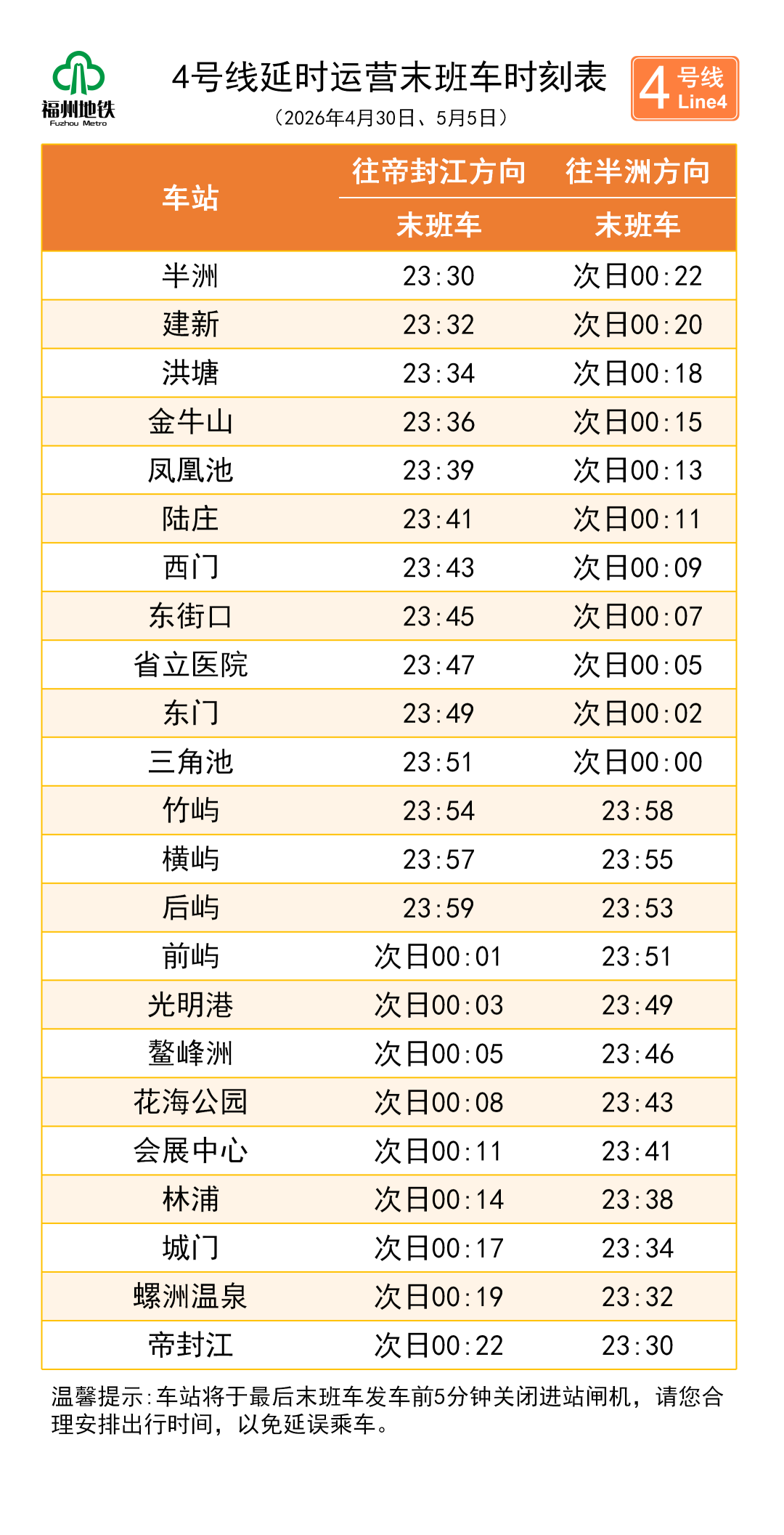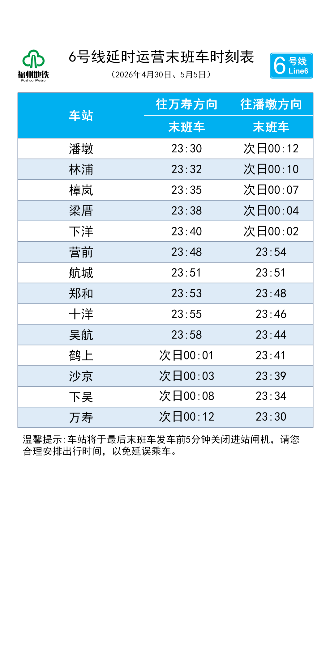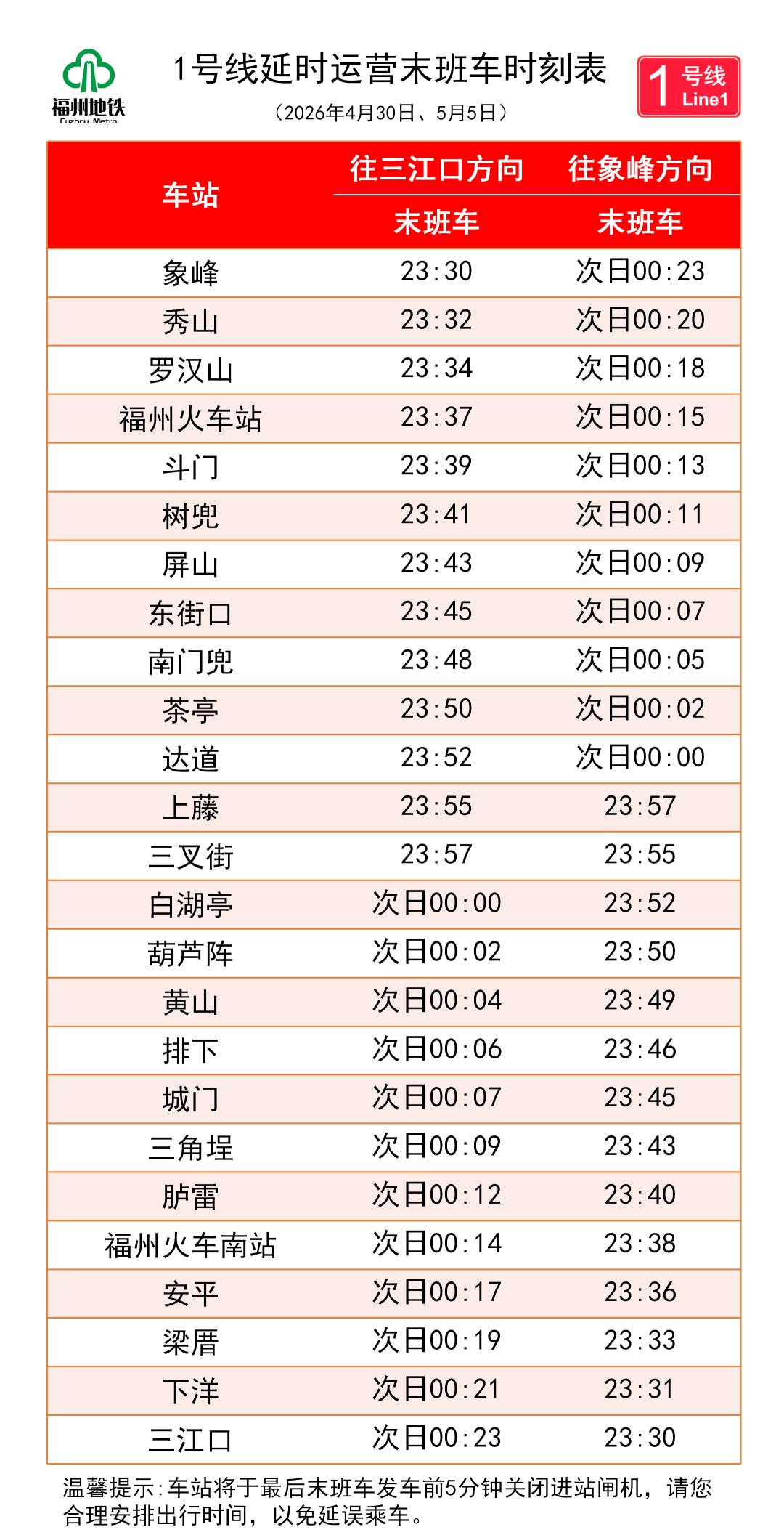 延长运营安排 4月30日(周四)、5月5日(周二)两天,福州地铁全线网(1号线、2号线、4号线、5号线、6号线、滨海快线)运营末班车统一延至23:30始发。5月1日至5月4日运营时间保持不变。 延长运营期间,各线路行车间隔为10分钟,滨海快线仅开行普通列车。 各线路延时运营末班车时刻表如下↓↓↓