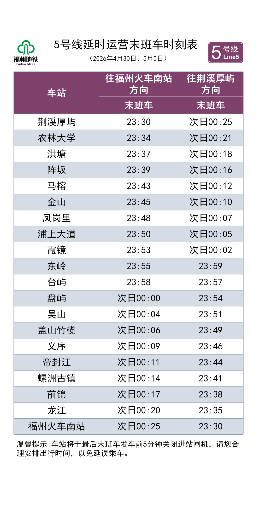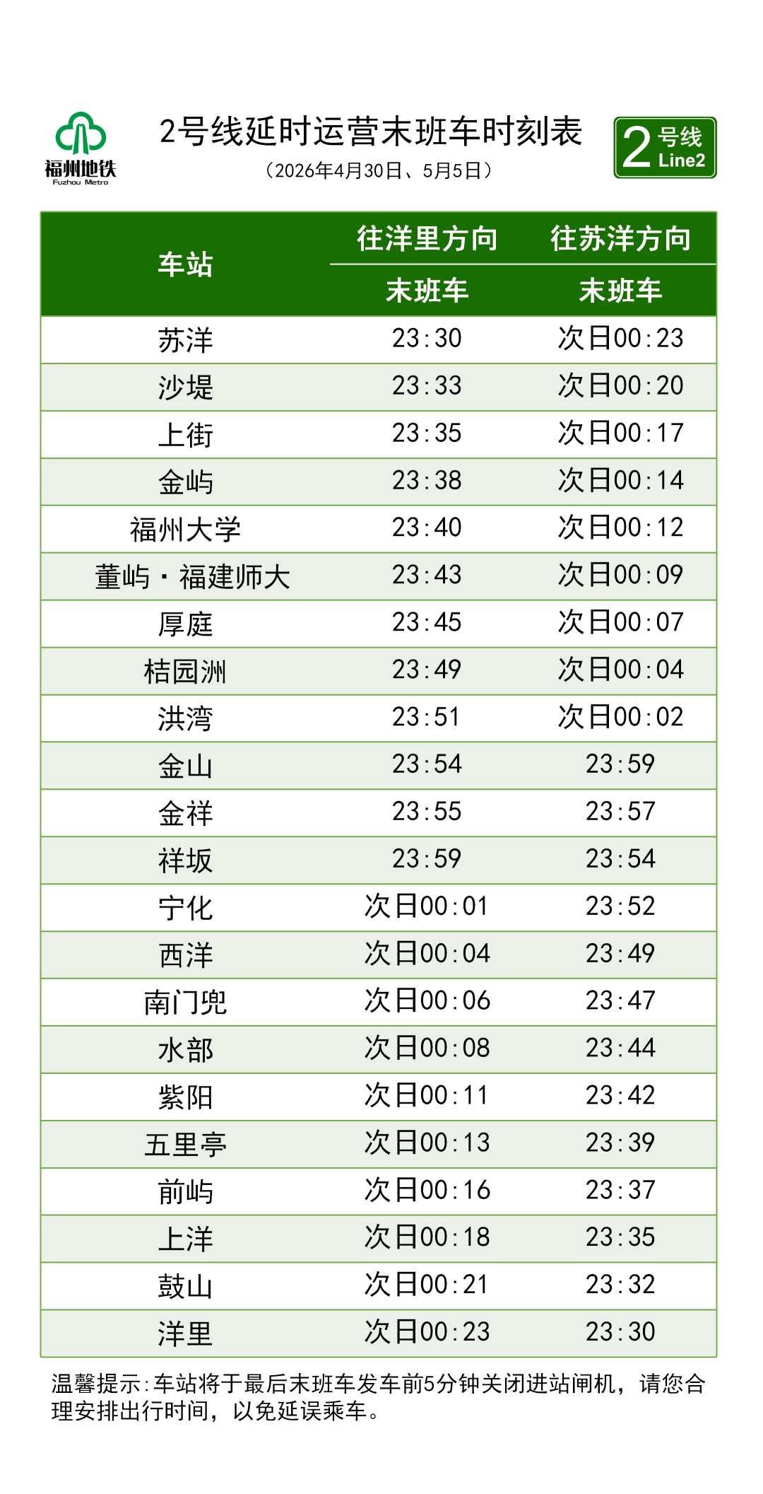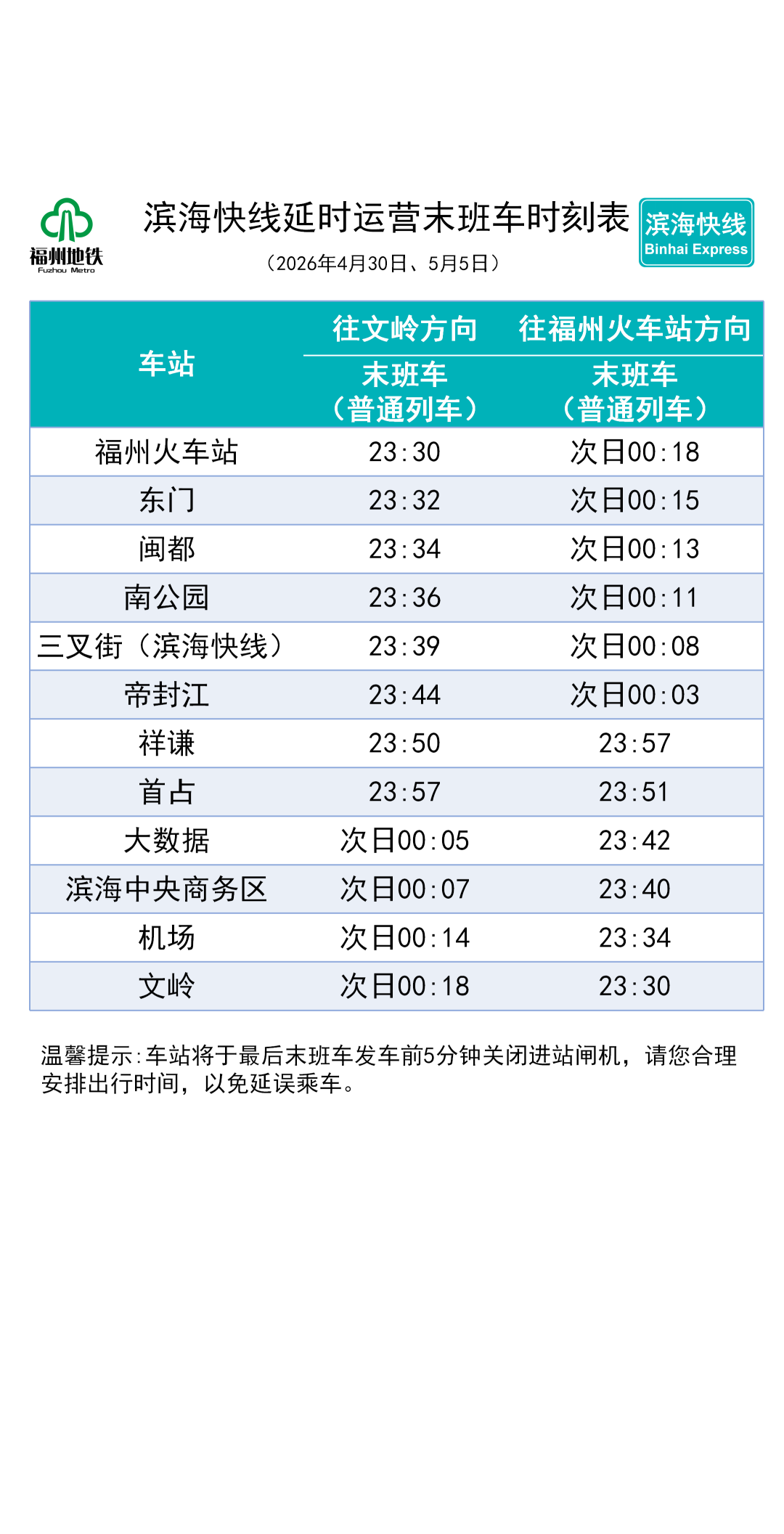 延长运营安排 4月30日(周四)、5月5日(周二)两天,福州地铁全线网(1号线、2号线、4号线、5号线、6号线、滨海快线)运营末班车统一延至23:30始发。5月1日至5月4日运营时间保持不变。 延长运营期间,各线路行车间隔为10分钟,滨海快线仅开行普通列车。 各线路延时运营末班车时刻表如下↓↓↓