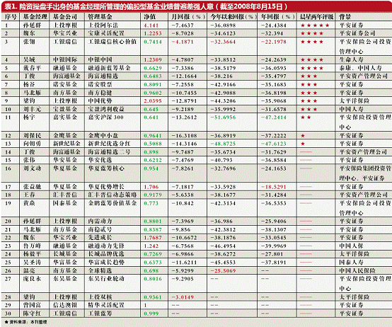覆巢之下无完卵,由40位保险公司出身的基金经理掌舵的基金亦撞上冰山,回报率亦差强人意。除去大环境的因素,原有的投资管理风格似乎也是左右基金业绩的重要因素。 按照本刊的统计,除一部分保险公司出身的基金经理,接手了一些运作成熟的明星基金,由于前期的积累,使得该基金目前仍然保持着较好的回报外,40位保险公司出身的基金经理在担任偏股型基金时大都出现了“水土不服”的症状,而在管理固定收益类产品时更为得心应手。 偏股型不掂 本刊统计显示,在偏股式基金的管理中,除少数几个人之外,大部分保险行业出身的基金经理表现差强人意。 晨星统计数据显示,今年以来截至8月18日,在可比的231只偏股式基金中,由张翎管理的工银瑞信核心价值排名最高,今年以来收益为-32.3664%,排在第21位,其次是排在25位的华夏蓝筹核心(见表)。