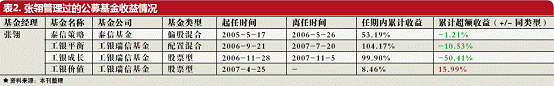 毕业于英国利物浦大学的张翎,先后在陆家嘴金融贸易区开发股份有限公司、中国平安保险公司投资管理中心等公司从事投资管理工作。2002 年起任职于泰信基金管理有限公司,2004年7月至2005年5月,担任泰信天天收益基金经理,2005年5月至2006年5 月担任泰信先行策略基金经理。2006年5月,加入工银瑞信基金管理有限公司,2006年9月至2007年7月,担任工银瑞信精选平衡混合型基金基金经理。2006年12月起至2007年11月,担任工银瑞信稳健成长基金基金经理。2007年4月至今,担任工银瑞信核心价值股票型基金基金经理。 该基金的晨星两年评级为四颗星,今年以来基金回报率比表现最好的东吴价值成长低了7.74个百分点。 本刊统计显示,张翎管理过的四只基金中,只有现在的这只工银价值的任期内基金累计收益是高于平均水平的,其余的几只基金普遍低于同业水平(见表),