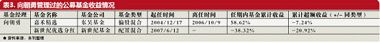 由其管理的工银成长更是在去年的大牛市中比平均水平低了50.41 个百分点。 值得注意的是,工银价值成立于2005年8月底,第一任基金经理为曾经的“明星”江晖,他于2005年8月至2007年4月管理工银价值基金,两年时间,基金业绩表现为197.06%。当年7月,江晖转投私募。 根据本刊的长期跟踪,截止2008年上半年,江晖操控的星石系列全部产品,是全部84只阳光化私募产品中唯一一只在各考察期内均实现正收益的产品,表现极为稳健,投资能力为业内人士所认同。 或许缘于此,一位基金研究人士认为,工银价值如今的业绩表现与江晖任职期间所打下的基础不无关系。 另一个有些类似的例子是,曾经由吕俊掌舵的上投摩根中国优势由梁钧接手,巧合的是,梁钧亦是出身保险界。2003年梁钧就职于中国太平洋 (601099 股吧,行情,资讯,主力买卖)保险公司资金运用中心,从事债券投资及投资策略,并参与了几百亿资金的债券投资管理。2004年5月任职于泰达( 湘财)荷银基金管理有限公司,历任基金经理和固定收益部总经理,负责公司旗下所有基金的债券和可转债投资,担任泰达荷银风险预算基金和泰达荷银货币基金的基金经理。2007 年3月加入上投摩根基金管理有限公司,目前担任中国优势和上投双核的基金经理。 本刊统计发现,梁钧曾经掌管的荷银预算,在其任期内累计收益为59.05%,大大低于同期同类基金的平均业绩水平112.08%。然而,其在上投摩根期间的两只基金目前虽处于亏损状态,但依然略高于同类基金的平均水平。 然而,另一个更刺激的事实是,在由曾经的险资操盘手管理的30只偏股型基金中,22只都已跌破净值。 其中,向朝勇掌管的新世纪优选分红8月15日的净值为0.5088,几乎“腰斩”,其今年以来的回报(48.8725%)排在231只偏股式基金中排在第210位,而在晨星的两年评级中,该基金也仅有一颗星入账。 和吕俊、孙延群等一样,向朝勇也出自平安证券。 向朝勇,1996年3月毕业于上海财经大学国际贸易专业,获硕士学位,硕士研究生毕业后曾在宝钢国际贸易总公司从事投融资工作。1997年11月进入平安证券有限责任公司,从事证券自营投资工作,先后担任多个投资管理岗位的职务。2002年7月加盟东吴证券有限责任公司,任投资总部副总经理, 2003年11月进入东吴基金管理公司,任投资管理部总经理兼东吴嘉禾优势精选基金经理。现供职于新世纪基金管理有限公司,任总经理助理兼投资管理部总监,兼任新世纪优选分红的基金经理。 根据德圣基金研究中心统计,向朝勇管理嘉禾精选不到两年时间,任期内累计收益为58.62%,比同类基金平均水平低了7.24个百分点,而自2007年管理新世纪优选分红的一年多时间中,累计亏损38.32个百分点,和同类基金平均收益相比低了20.92个百分点(见表)。