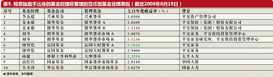 值得注意的是,2007年度换手率清单显示,该基金2007年的换手率高达2400%。而同期,所有基金的平均换手率仅为326%。从2007年年报中看,新世纪优选,07年初的时候股票市值1.2亿,年末7.5 亿。但全年买入股票107亿,卖出股票108亿;再看中报,新世纪优选2007年6月30日股票市值14亿,前半年买入股票70亿,卖出61亿。 业内人士称,2400% 的换手率意味着每15天就把全部股票换一遍,这对一个小散户也不是容易做到的事情,何况一个几亿资产的公募基金。该人士称,建议投资者远离换手率如此之高的基金。 长于固定收益 不过,这并不意味着险资操盘手在基金业没有用武之地。 相对于偏股式基金的不佳表现,本刊统计显示,一个更明显的事实是,保险出身的基金经理在债券型或固定收益类基金领域内明显得心应手一些。 比如,晨星数据显示,在55只可比的债券型基金中,有保险背景的基金经理管理的债券型基金共计13 只,其中有三只基金在今年以来的回报率中挤进前十,分别是大成基金的三只基金,即使是表现最差的嘉实债券亦为中游,位列第27 位。 此外,根据本刊统计,保险出身的基金经理所管理的10只货币型基金,其七日年化收益率也基本维持在2.8%左右,略高于同类基金2.67%的平均水平(见表)。