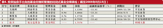 另一个事实是,有保险背景的基金经理管理的保本基金的表现更为突出。根据本刊统计,目前市场上仅有4 只保本基金,姜永康管理的银华保本增值表现突出,银华保本8月15日单位净值为1.0077,今年以来收益为-7.9322%,是同类型基金中表现最好,比南方避险增值 高了将近15个百分点。 该基金的基金经理姜永康,曾就职于中国平安保险(集团)股份有限公司,历任资产营运中心研究员、组合经理;2005年10月加入银华基金管理有限公司,历任养老金管理部投资经理,投资管理部基金经理助理。 业内人士称,有保险出身的基金经理之所以管理固定收益类产品较为出色,与保险公司本身资金大部分需要配置于固定收益品种的特点有很大关系。很多管理债券型、货币型基金的人,都有在保险公司的固定收益部工作的经历。此外,根据本刊统计,目前有455只封闭式基金由保险出身的基金经理掌管,这5只封基截至到8月15 日,在33只封闭式基金中,有4只排在前15名,仅有基金金鑫跌破净值,排在第28位(见表)。