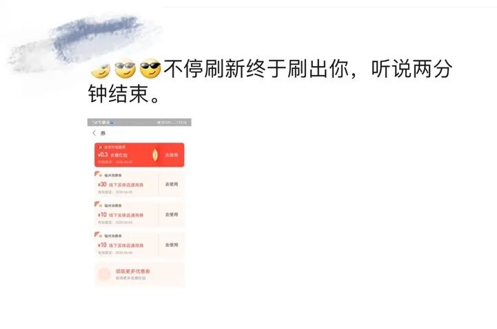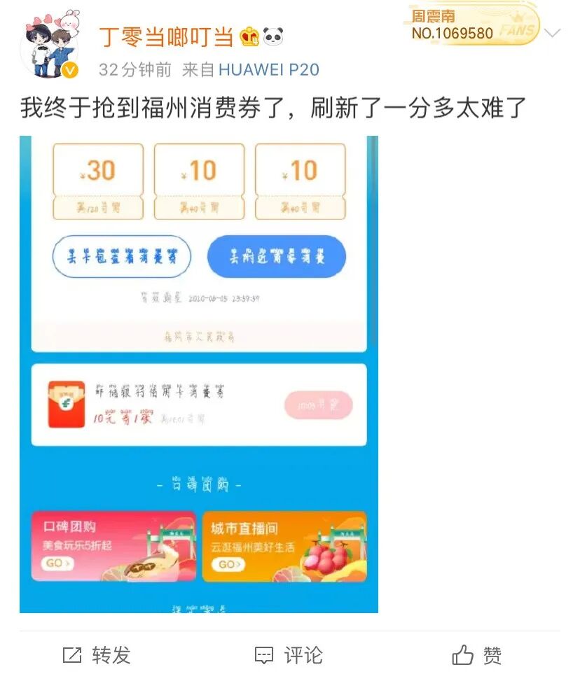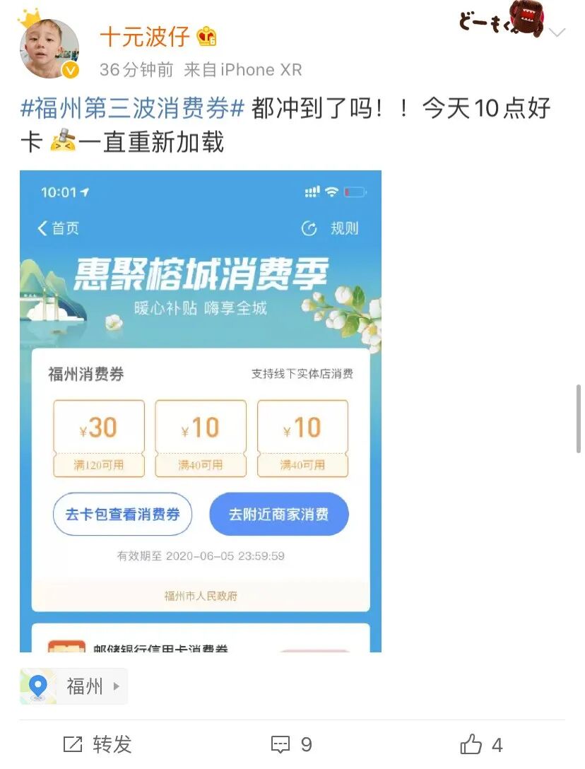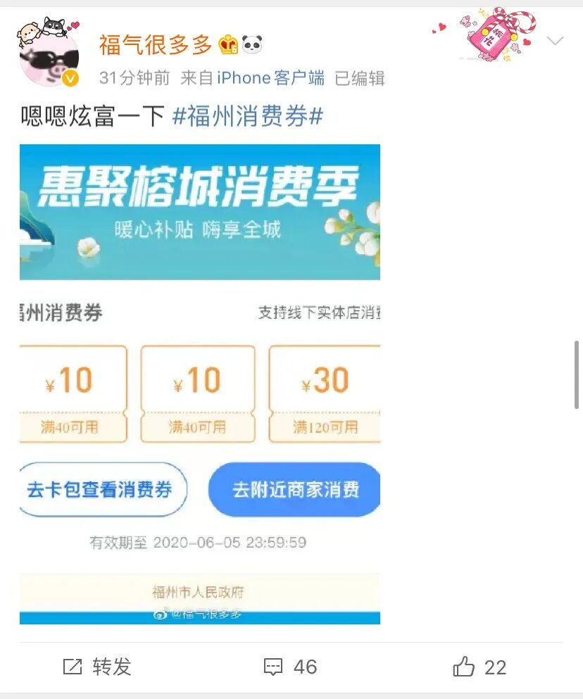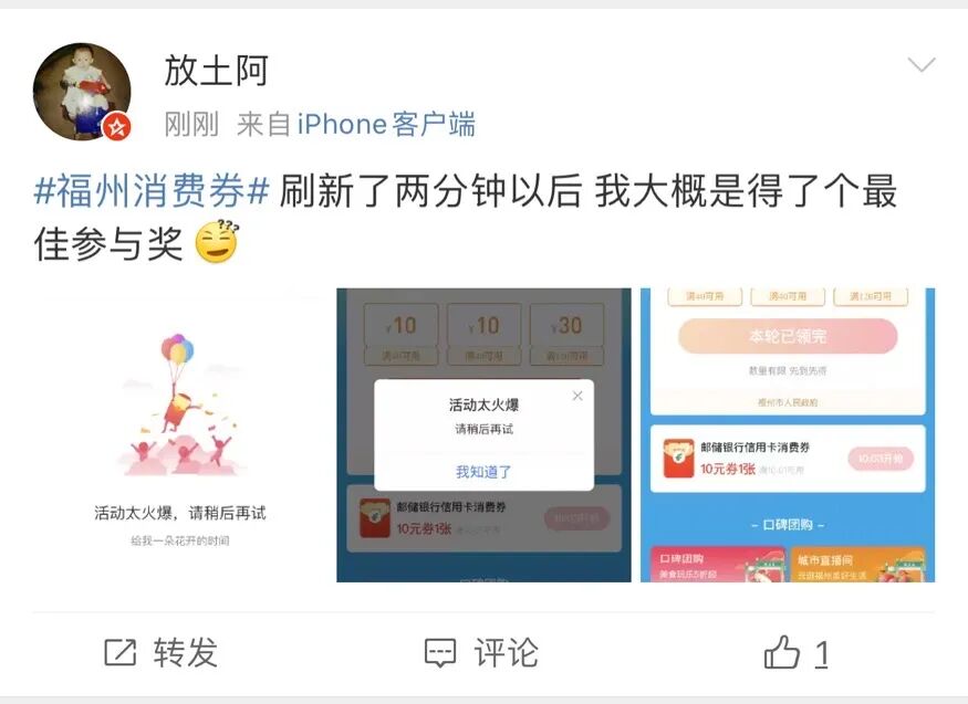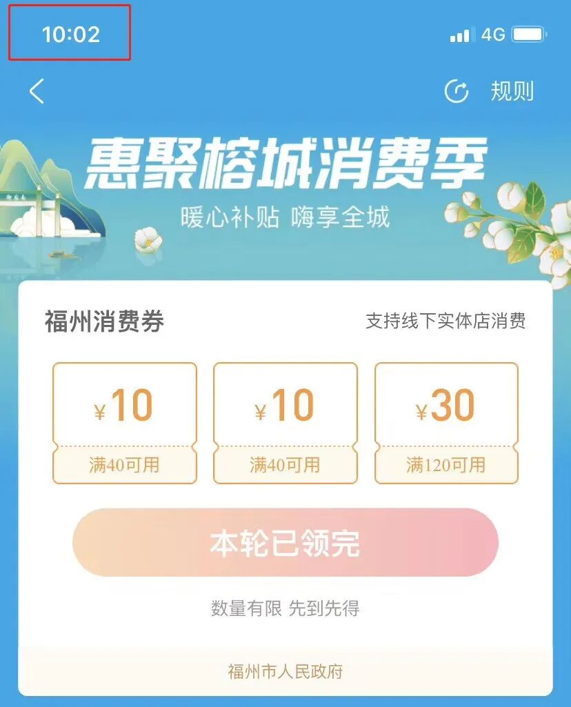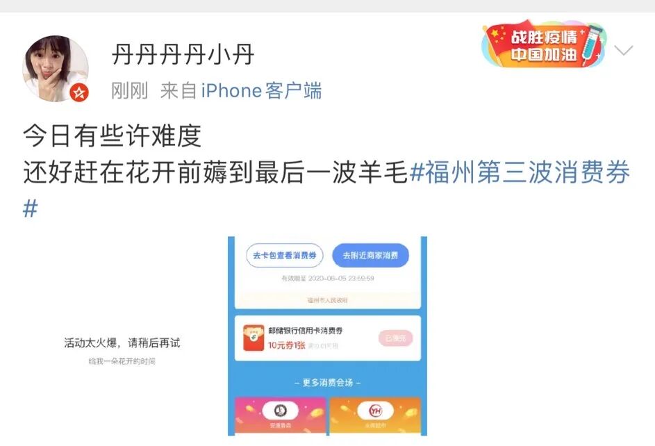 太太太 火爆了!!! 刚刚! 你抢到了吗? 今天上午10点 福州最后一轮3500万元消费券 开放领取 经过两轮的抢券 大家的手速都变快了 抢券的页面一度显示网络拥堵 让人忍不住直呼: ”太刺激啦!“ 不少人就这样 被“堵”在了领券的路上 和最后一波消费券擦身而过 当然也有不少小伙伴 成为了70万分之一的幸运儿 纷纷开始”炫富“ 即有效期 自发放之日起至 6月5日24:00 可以使用消费券的 部分精选商家 |