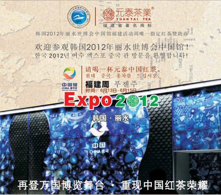 韩国2012年世博会将于5月12日至8月12日在韩国丽水举办。本届世博会的主题为“生机勃勃的海洋及海岸:资源多样性与可持续发展”。截至目前,已有104个国家确认参展丽水世博会。 韩国丽水世博会中国馆位于太平洋展区,展馆面积约1050平方米。中国馆初步确定“人海相依”的展示主题,将以可持续发展为主线,从海洋和海岸开发与保护、海洋科技、海洋文化三个角度,介绍我国的海洋事业发展成就和发展目标,传达中国人民关爱海洋,构建人与海洋和谐关系的海洋事业发展理念。福建周的活动时间为:2012年6月13日—15日,主题定为:“潮涌海西,蓝色福建”!本次,元泰茶业将作为指定红茶赞助商鼎力支持中国馆的福建活动周部分。 元泰茶业作为福建省本土红茶企业,一直以“复兴中国红茶而努力奋斗”为愿景。继2010年作为福建馆指定红茶供应商参展上海世博会,本次2012丽水世博会,元泰茶业继续为世界展现元泰中国红茶的独特魅力,中国红茶将又一次惊艳亮相!为本届丽水世博会,元泰茶业精心设计制作的元泰中国红茶纪念茶包将派发至世界各地的游客手中,茶包含元泰经典红茶及详细说明介绍,包装采用中英韩三语印制,以最全面最有效的方式将中国红茶的博大精深和元泰茶业所提倡的精致生活推广给韩国友人。 元泰茶业预祝本届韩国2012丽水世博会圆满成功!“再登万国博览舞台、重现中国红茶荣耀”,让我们万人共饮,同喝一杯茶! 元泰茶业行政部(宣)