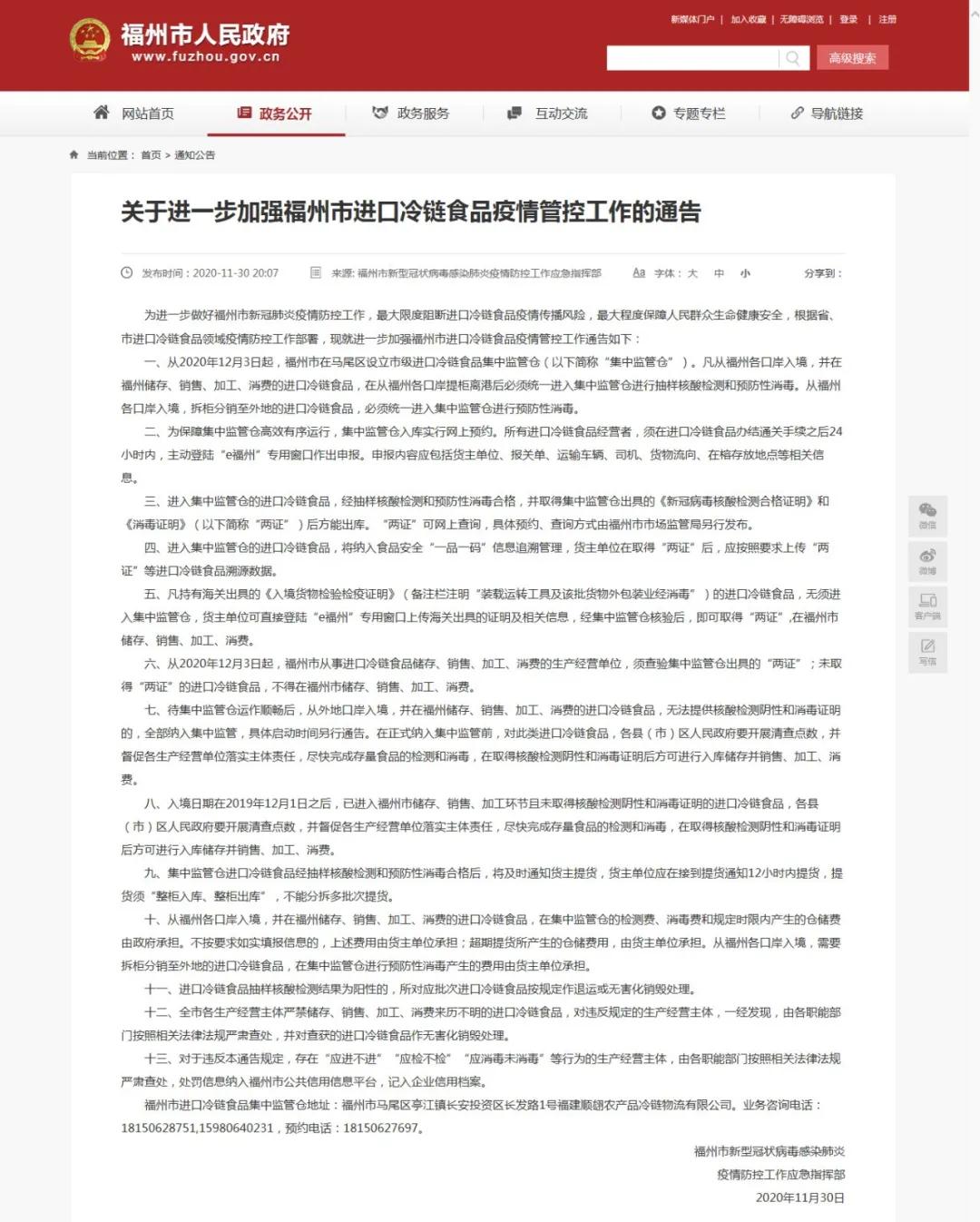 福州市市场监督管理局 2020年11月30日 相关链接: 福州市新型冠状病毒感染肺炎疫情 防控工作应急指挥部 发布最新通告 为进一步做好福州市新冠肺炎疫情防控工作,最大限度阻断进口冷链食品疫情传播风险,最大程度保障人民群众生命健康安全,根据省、市进口冷链食品领域疫情防控工作部署,现就进一步加强福州市进口冷链食品疫情管控工作通告如下: