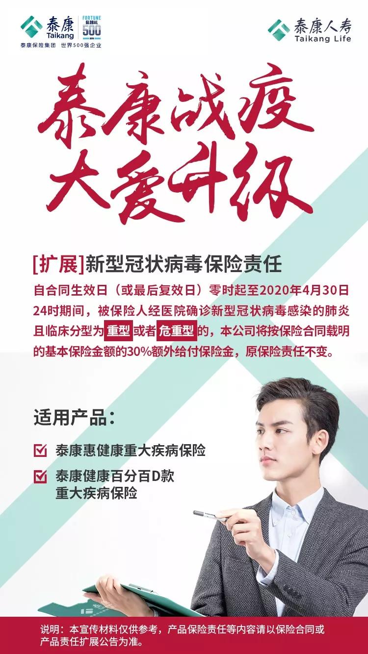 福建消费网-福建新消费讯 尊敬的客户:病毒无情,泰康有爱!为更好地为广大客户提供保障,体现保险行业的爱与责任,根据银保监会文件精神,泰康人寿保险有限责任公司(以下简称“本公司”)特针对《泰康惠健康重大疾病保险》等六款产品的保险责任进行扩展,具体如下: 一、责任扩展说明 自合同生效日(或最后复效日)起,被保险人经医院确诊新型冠状病毒感染的肺炎且临床分型为重型或者危重型的(详见本公告“四、释义”),本公司将按保险合同上载明的基本保险金额的30%额外给付保险金,原保险责任不变。 保险责任扩展具体适用产品详见本公告“五、适用产品列表”。 二、责任扩展有效期 2020年4月30日(含)之前,被保险人经医院确诊新型冠状病毒感染的肺炎且达到临床分型为“重型”或者“危重型”状态。 三、责任扩展特别说明 1.在合同生效日(或最后复效日)之前,被保险人已经确诊或者疑似新型冠状病毒感染的肺炎,不属于保险责任扩展的范围。 2.对适用产品不因保险责任扩展而上浮费率,且对该产品保险责任扩展前的老客户实行统一的理赔标准。 3.合同生效(或最后复效)后且保险责任扩展有效期结束之前,被保险人经医院确诊新型冠状病毒感染的肺炎的,无等待期。 四、释义 新型冠状病毒是指世界卫生组织(WHO)命名的“2019新型冠状病毒”(简称:2019-nCoV),感染新型冠状病毒须由国家卫生行政机关指定的医院或者国家正式卫生检疫机构确诊。 临床分型根据国卫办医函【2020】117号《关于印发新型冠状病毒肺炎诊疗方案(试行第五版修正版)的通知》(若有更新,以最新版为准)确定的临床分型。其中“重型”以及“危重型”的定义如下: 1.重型:符合以下任何一条: a)呼吸窘迫,RR≥30次/分; b)静息状态下,指氧饱和度≤93%; c)动脉血氧分压(PaO2)/吸氧浓度(FiO2)≤300mmHg(1mmHg=0.133kPa)。 2.危重型:符合以下情况之一者: a)出现呼吸衰竭,且需要机械通气; b)出现休克; c)合并其他器官功能衰竭需ICU监护治疗。 五、适用产品列表 1.泰康惠健康重大疾病保险 2.泰康健康百分百D款重大疾病保险 3.泰康附加康惠一生重大疾病保险 4.泰康附加康护一生重大疾病保险 5.泰康附加健康人生E款重大疾病保险 6.泰康附加健康人生D款重大疾病保险 |